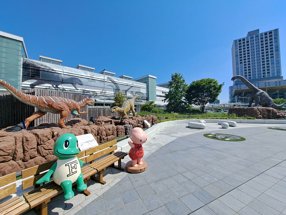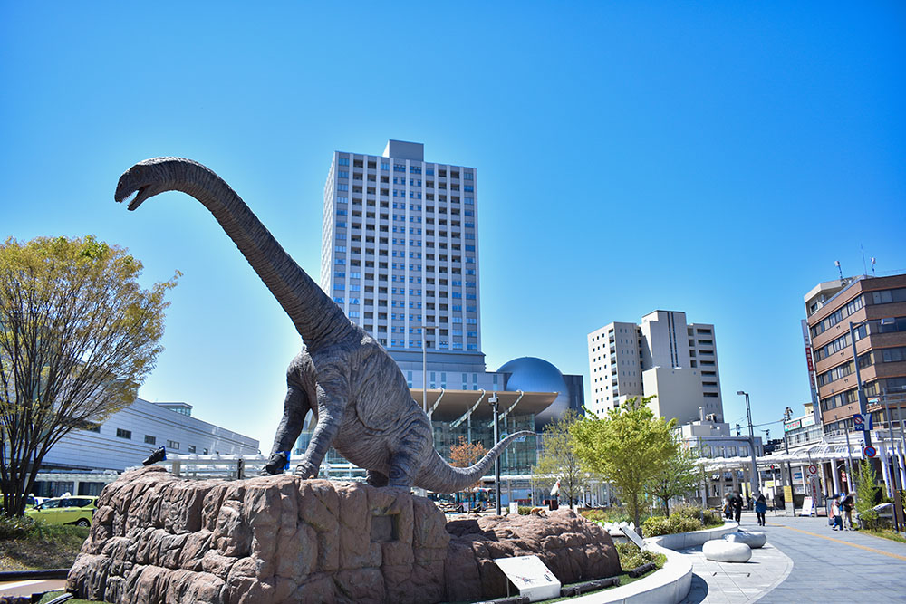 恐竜のロボットが目を引く福井の玄関口は、JR西日本、えちぜん鉄道、ハピライン福井が乗り入れています。駅前は商業施設や飲食店で賑わい、学生の姿も多く見られるエリアです。
